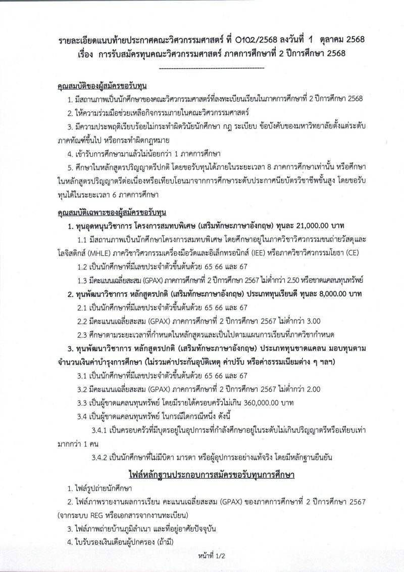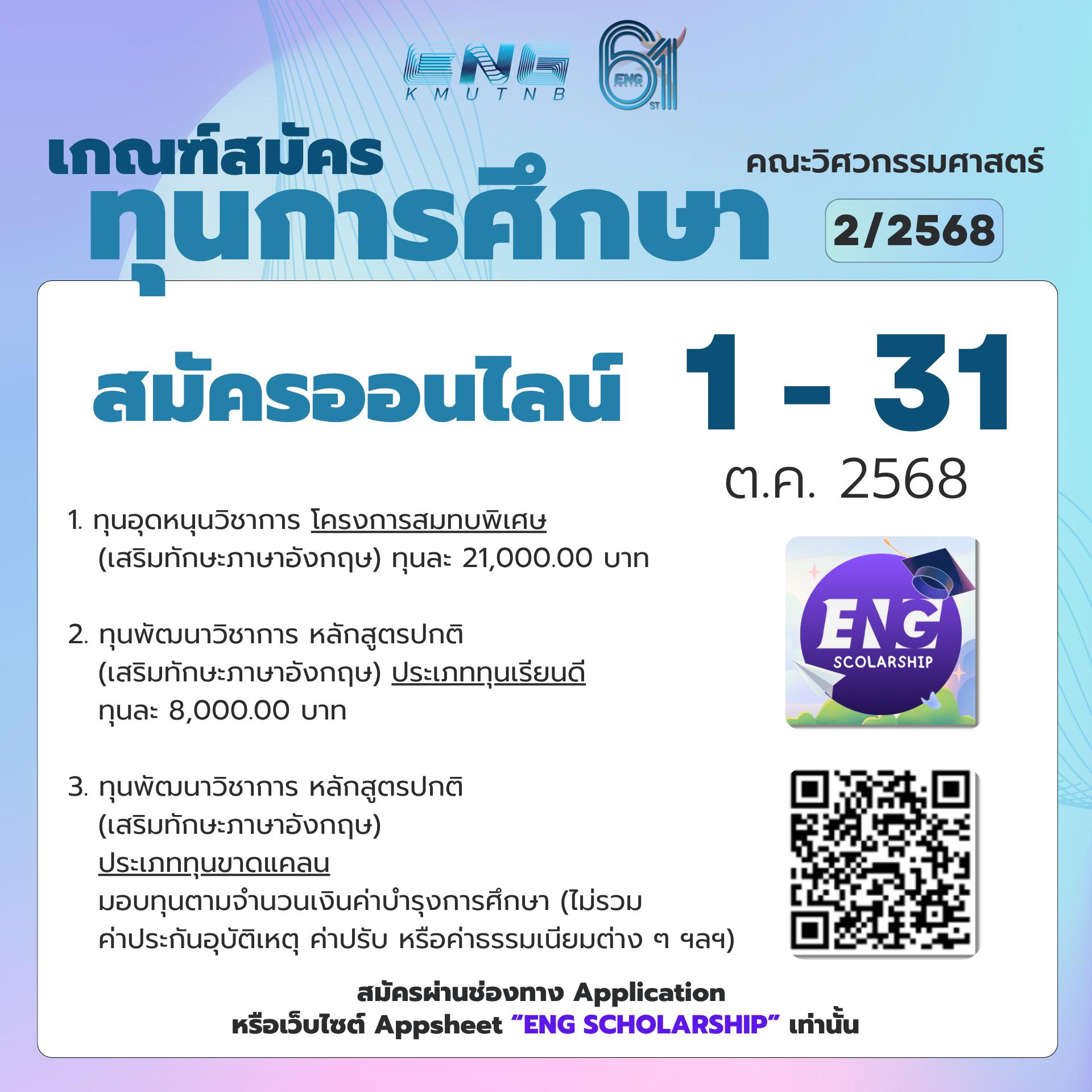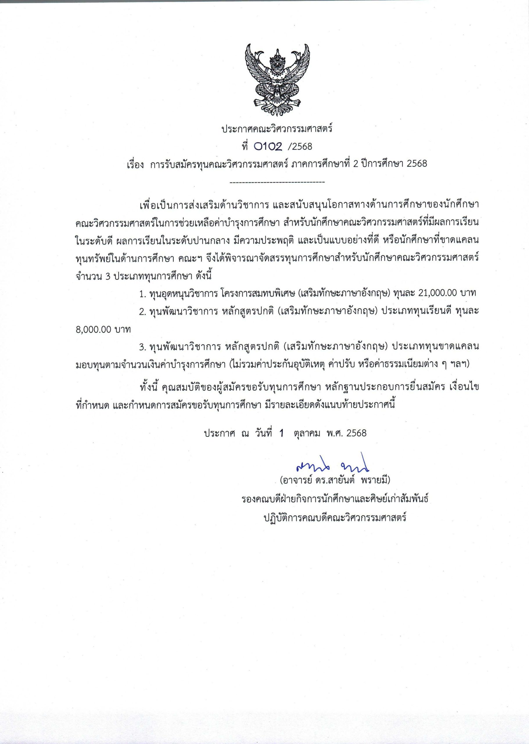 ประกาศ คณะวิศวกรรมศาสตร์เปิดรับสมัครทุนการศึกษา ภาคการศึกษาที่ 2 ปีการศึกษา 2568 จำนวน 3 ประเภททุนการศึกษา ดังนี้