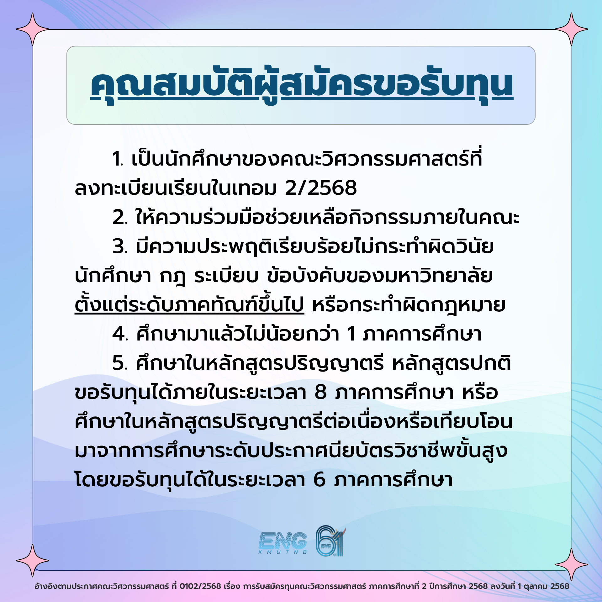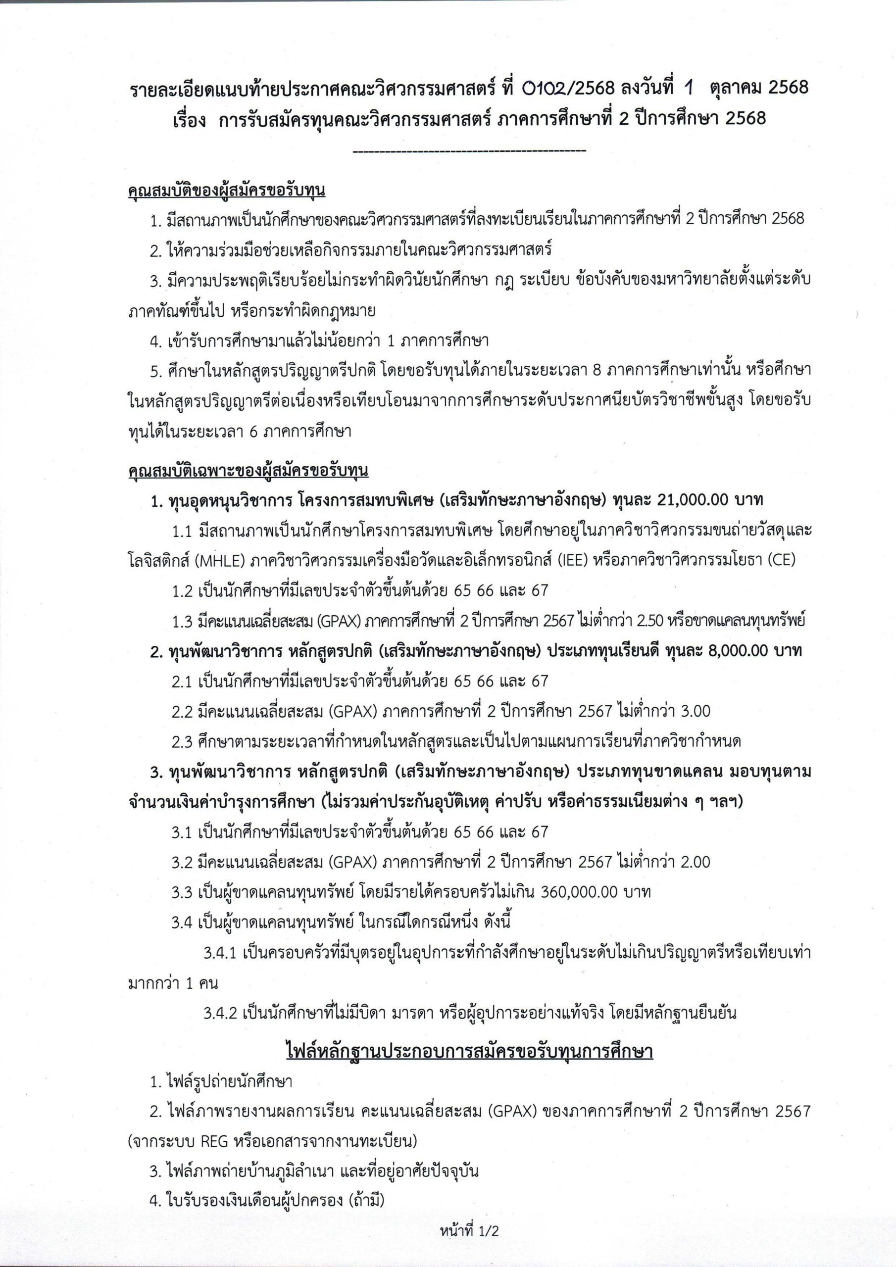 นักศึกษาผู้สนใจสามารถดูรายละเอียดคุณสมบัติ เกณฑ์ และเงื่อนไขที่กำหนดได้ตามโพสท์เอกสารที่แนบ