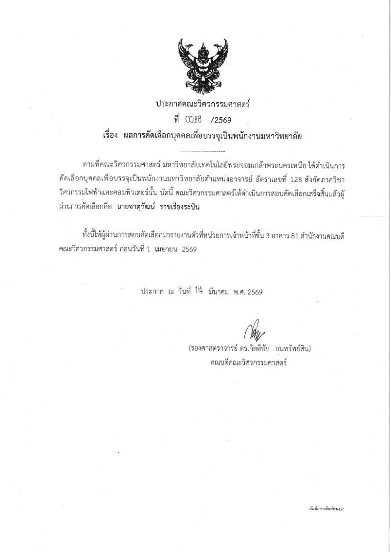 ผลการคัดเลือกบุคคลเพื่อบรรจุเป็นพนักงานมหาวิทยาลัย ภาควิชาวิศวกรรมไฟฟ้าและคอมพิวเตอร์