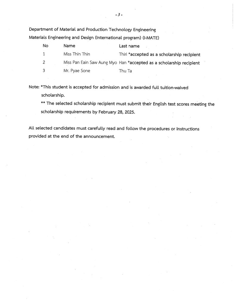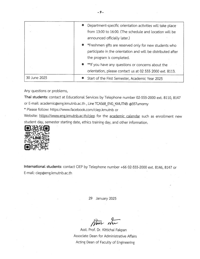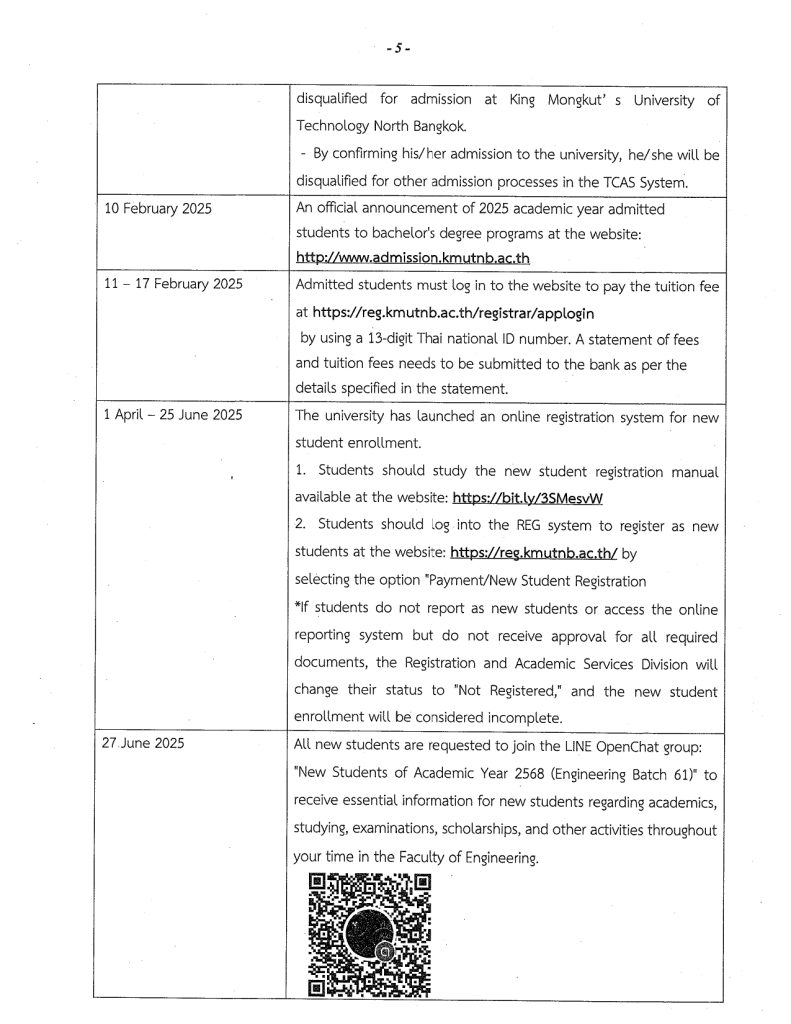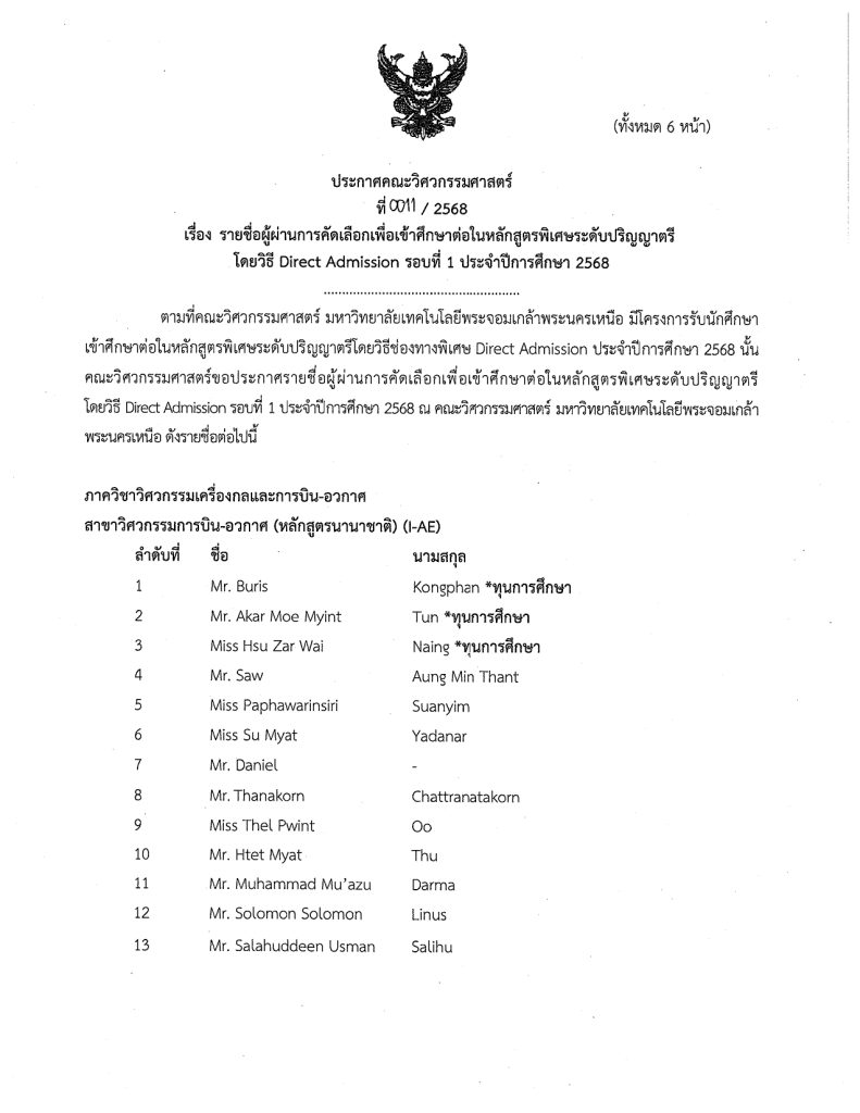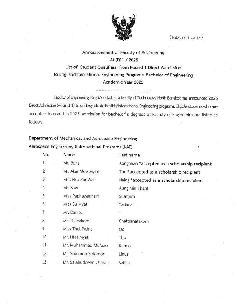 Announcement : List of Student Qualifiers from Round 1 Direct Admission to English/International Engineering Programs, Bachelor of Engineering Academic Year 2025