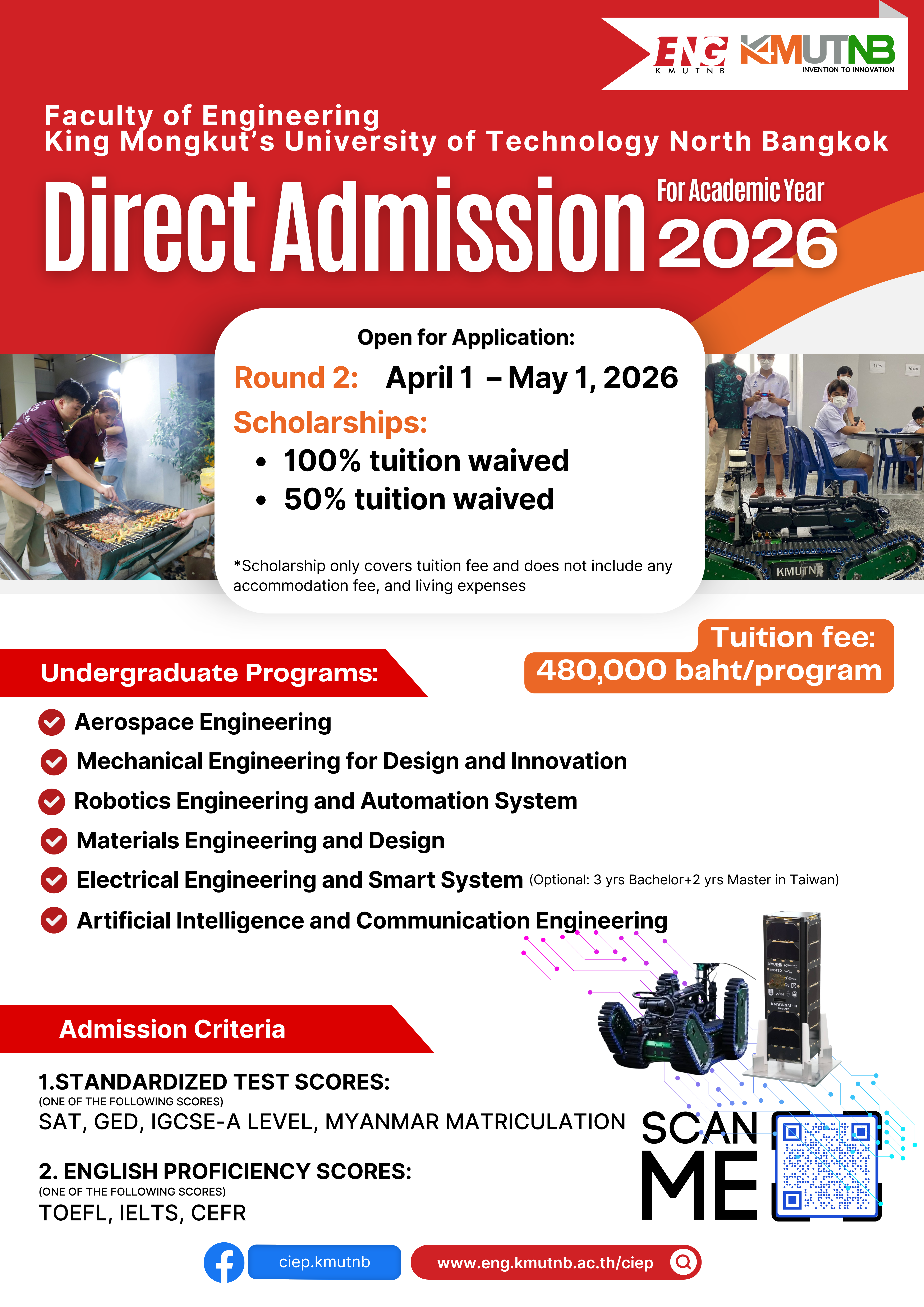 The Faculty of Engineering at King Mongkut’s University of Technology North Bangkok (KMUTNB) is now accepting applications for Direct Admission for the Academic Year 2026 (Round 2). We invite international and prospective students to apply for our specialized undergraduate engineering programs.