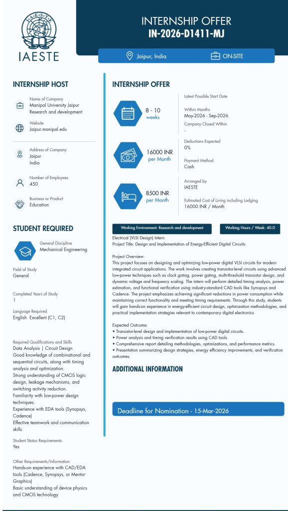 สาขาที่เปิดรับ: Mechanical Engineering (สาขาย่อย: Electrical / VLSI Design)