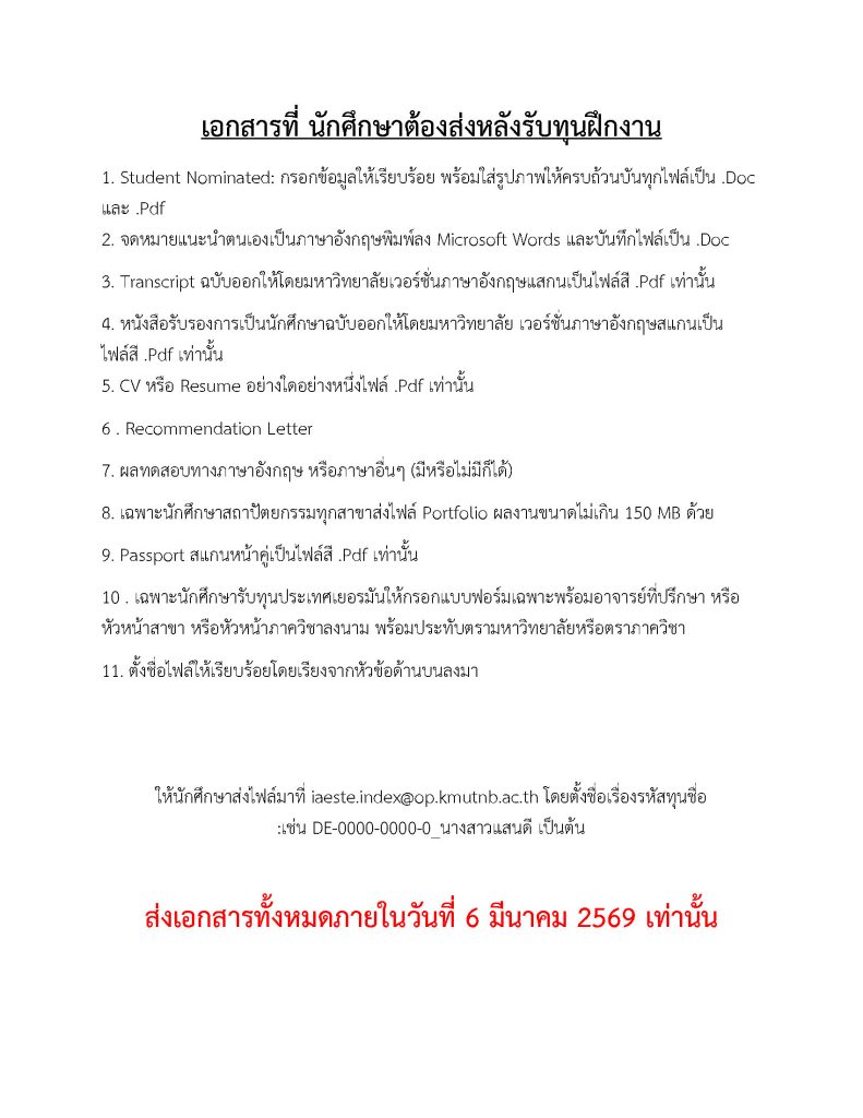 ให้นักศึกษาส่งไฟล์มาที่อีเมล iaeste.index@op.kmutnb.ac.th